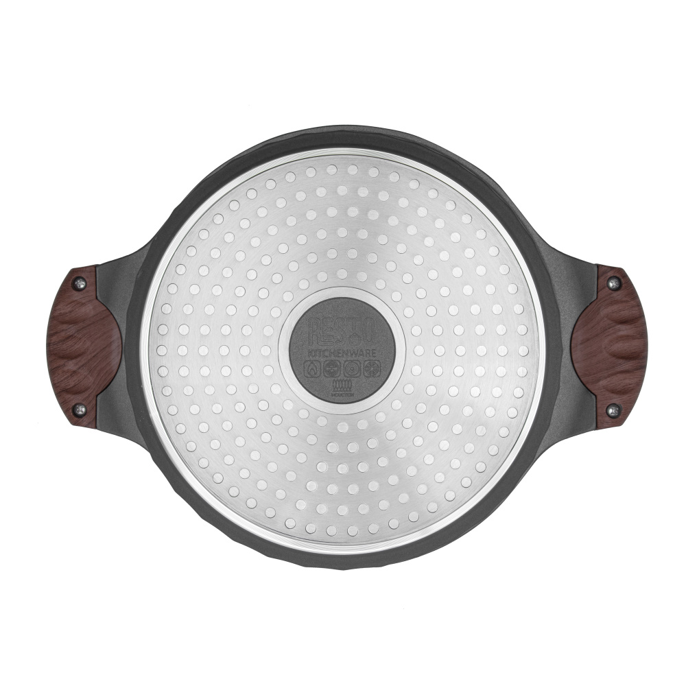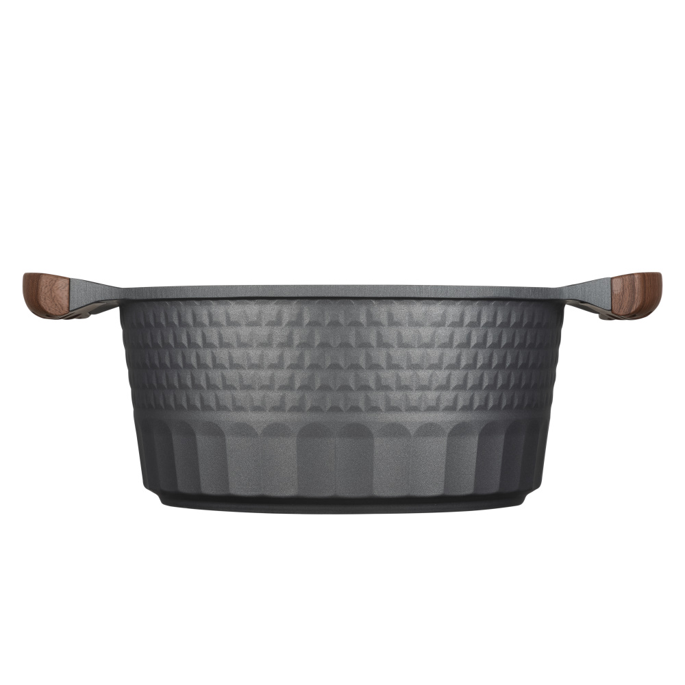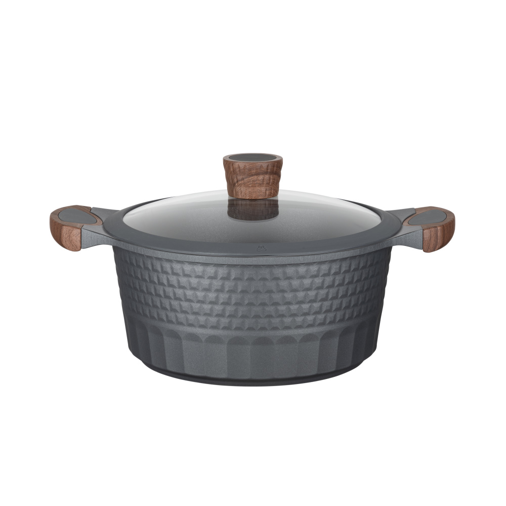 Κατσαρόλα αντικολλητική. Εσωτερική αντικολλητική επίστρωση, μοναδικός σχεδιασμός σώματος (3D εφέ), εργονομική ξύλινη μαλακή λαβή με θηλιά για να κρέμεται, γυάλινο καπάκι με έξοδο ατμού, ενισχυμένη επαγωγική βάση με δίσκο κατά της παραμόρφωσης, κατάλληλο για όλους τους τύπους κουζινών συμπεριλαμβανομένων και των επαγωγικών.