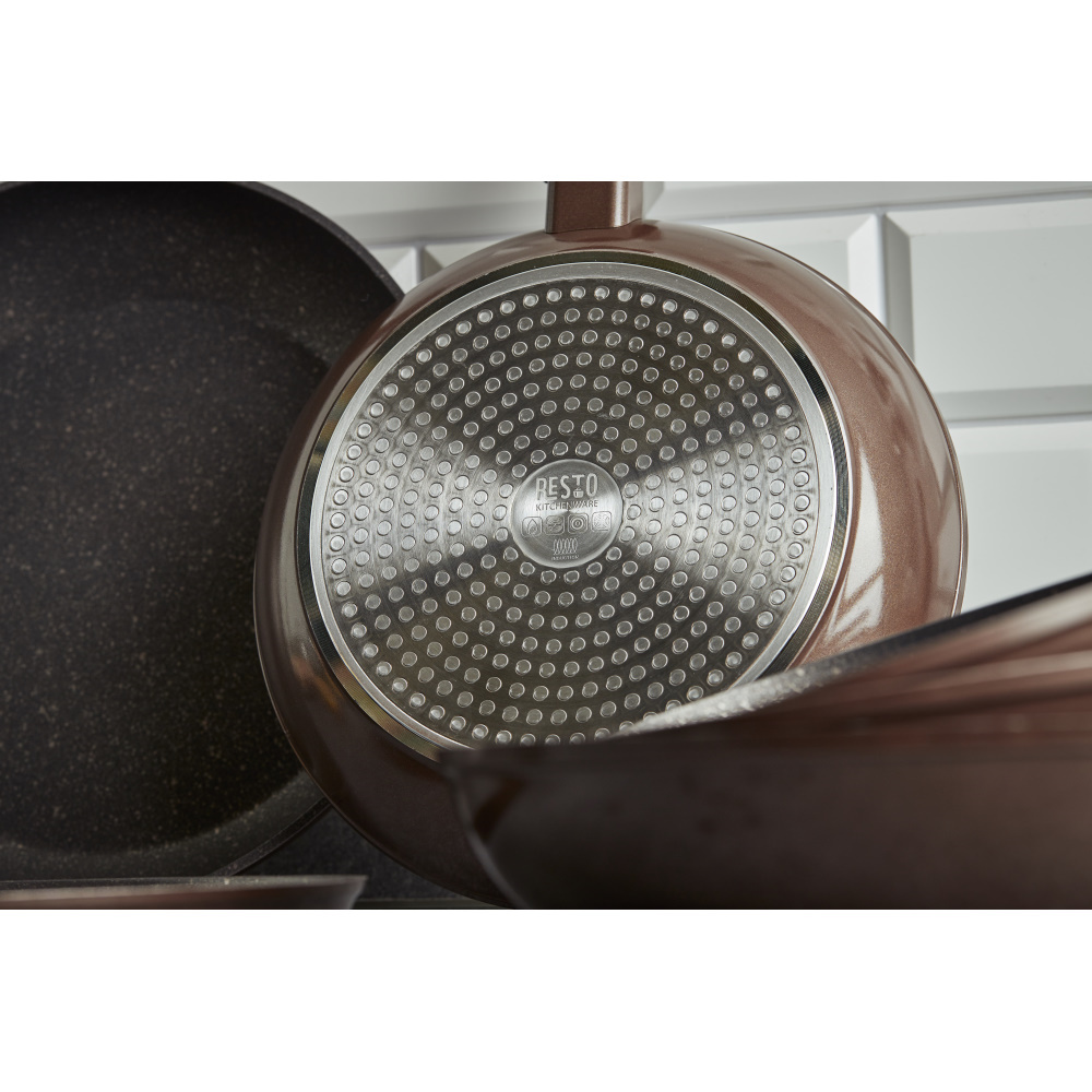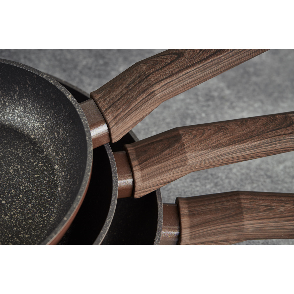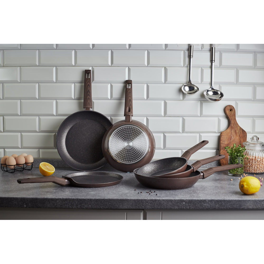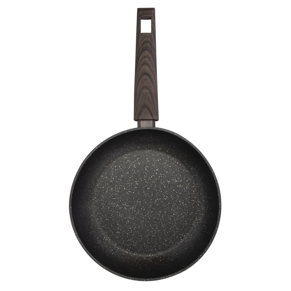 Τηγάνι αντικολλητικό. Σύγχρονος σχεδιασμός, εσωτερική αντικολλητική μαρμάρινη επίστρωση 4 στρώσεων με χρυσές κουκίδες, εξωτερικό καφέ ματ φινίρισμα ανθεκτικό στη θερμότητα, ξύλινη εργονομική λαβή μαλακής αφής. Επαγωγική βάση ενισχυμένη με δίσκο κατά της παραμόρφωσης, (κατάλληλο για όλους τους τύπους κουζινών συμπεριλαμβανομένων και των επαγωγικών).